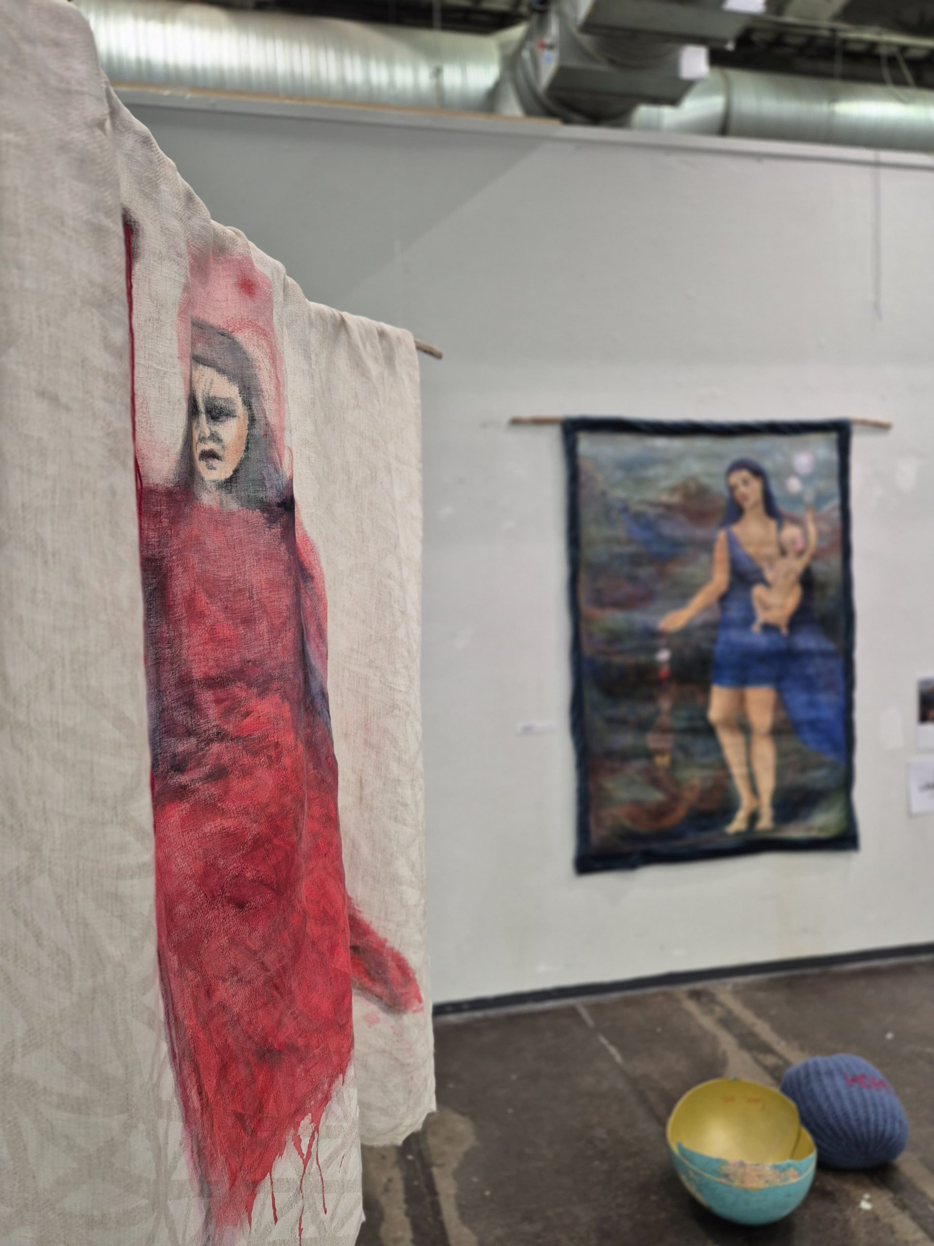 - Mother Earth’s Rage & Pietà of Biodiversity, paintings, each 150 cm × 120 cm, oil paint and acrylic on thin linen curtains. These paintings are counterparts: the sorrow of the blue Madonna and the anger of the red Mother Earth both stem from the defense of life.