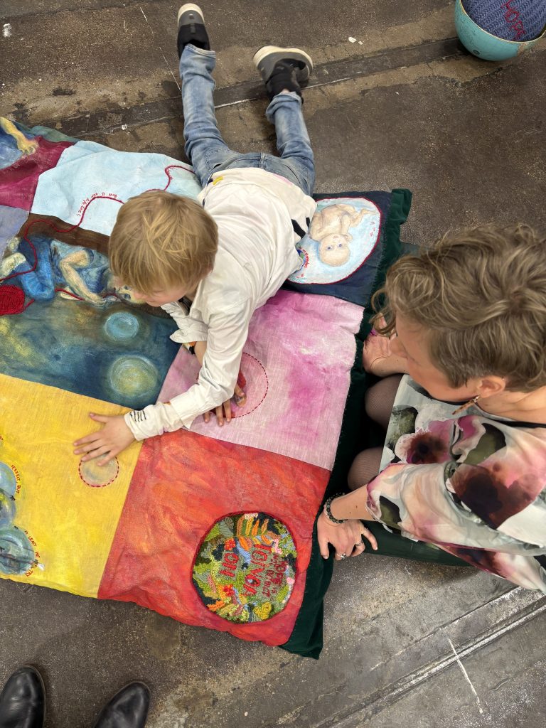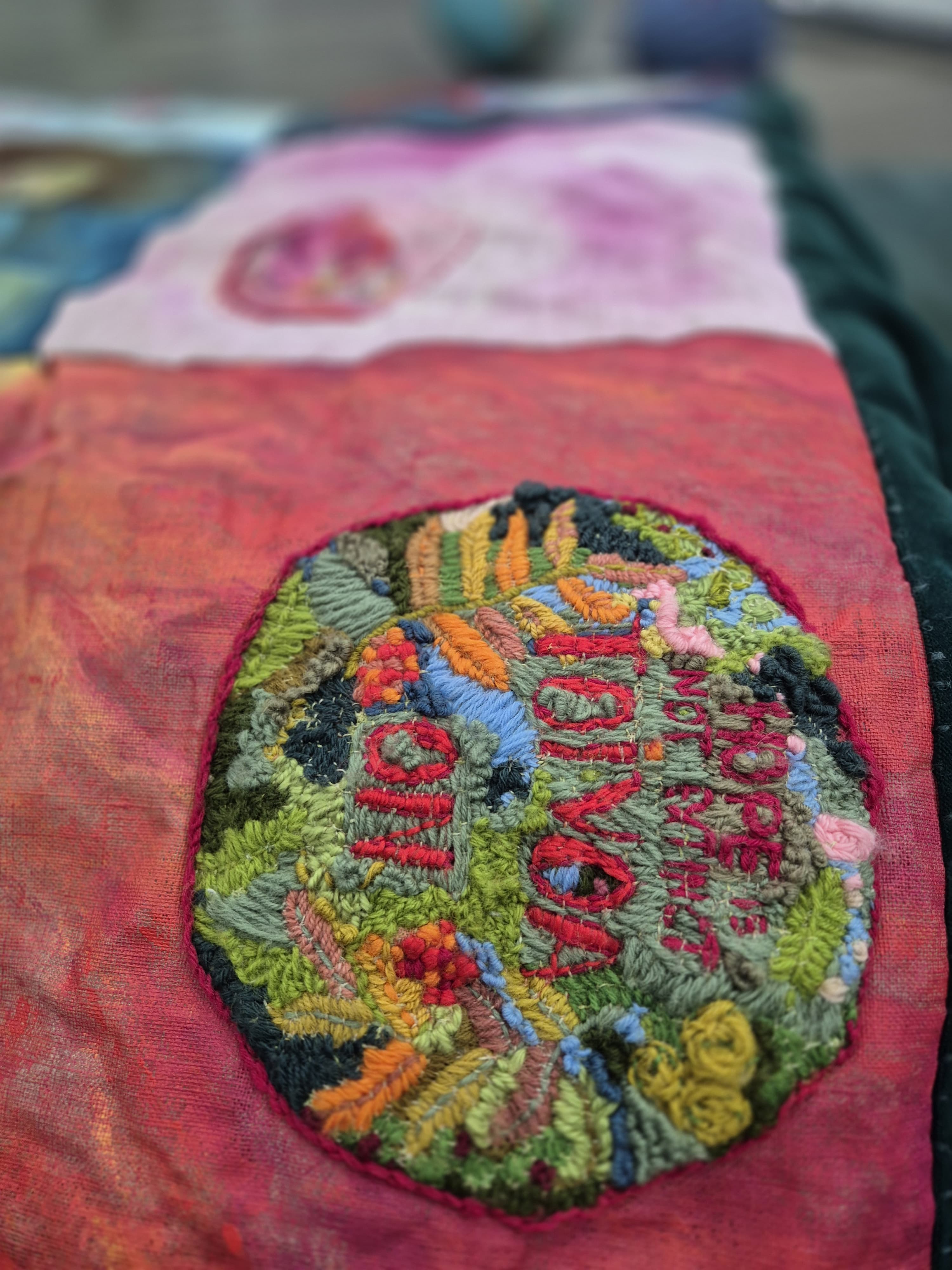 - Climate/Emotion/Climate Quilt, 190 cm × 140 cm, oil paint, acrylic, and embroidery on recycled fabrics. Visitors are encouraged to touch the quilt and even crawl under it to explore their climate emotions and emotional climate. The quilt features depictions of 12 different emotions related to climate change.
