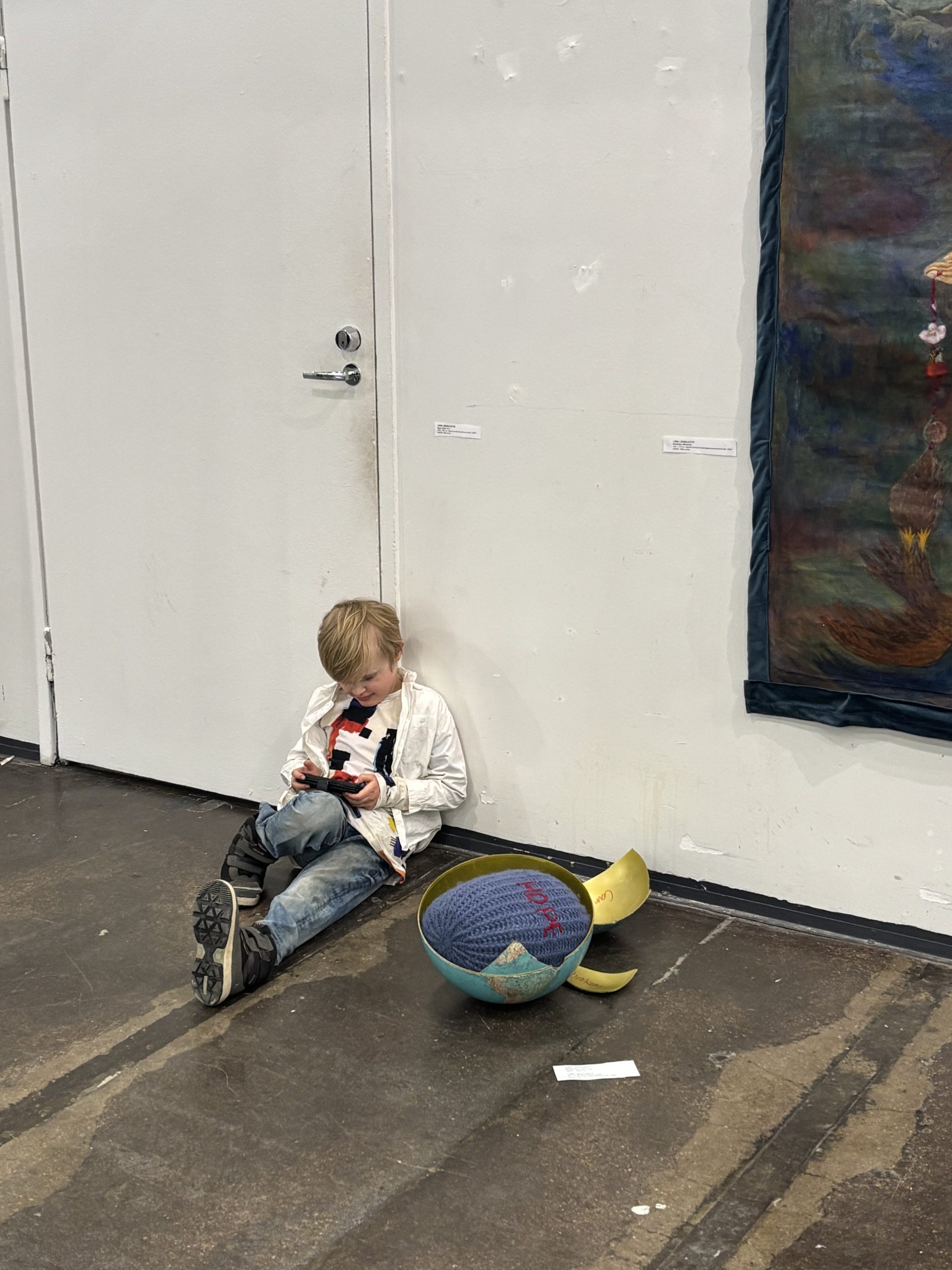 - Writing Corner, featuring a hand-painted chair, a small table, and a velvet pillow embroidered with the question, What do I feel today? — a soft object to hold while contemplating climate emotions. Visitors are encouraged to write down their thoughts and feelings about climate change in the artwork’s guestbook or draw hopeful soap bubbles on recycled fabrics.